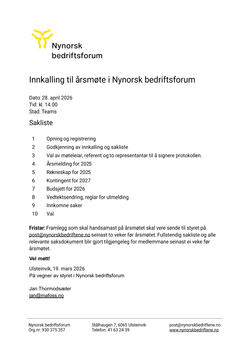 Fristar: Framlegg som skal handsamast på årsmøtet skal vere sende til styret på post@nynorskbedriftene.no seinast to veker før årsmøtet. Fullstendig sakliste og alle relevante saksdokument blir gjort tilgjengeleg for medlemmane seinast ei veke før årsmøtet.